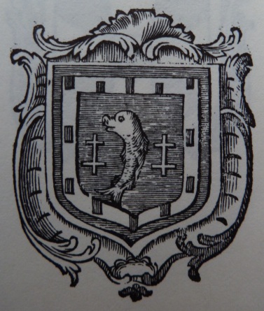 au dauphin d'argent accosté de 2 croix de Lorraine du mesme, à un orle