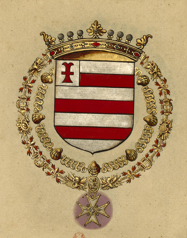 Armoiries :D'argent à 3 fasces de gueules ; au franc-canton aussi d'argent chargé d'un roc d'échiquier de gueules. Supports : un homme et une femme sauvages au naturel. Cimier : une tête de licorne d'argent. Source : Les noms surnoms qualitez, armes et blasons des chevaliers de l'ordre du Sainct Esprit. Creez par Louys le Juste XIII du nom roy de France et de Navarre a Fontaine-bleau, le 14 may 1633. Par Pierre d'Hozier. BNF, Bibliothèque nationale de France, département Réserve des livres rares, RES-LL14-23. |