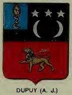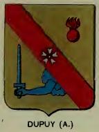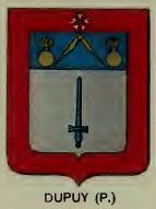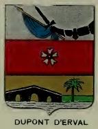 DUPONT D'ERVAL Vast-Robert-Constant DUPONT D'ERVAL (1758-????), adjudant-commandant, chevalier de l'Empire par lettres patentes du 19 septembre 1810. Règlement d'armoiries : Tiercé en fasce d'argent de gueules et d'or : l'argent, au dextrochère brassardé mouvant à dextre de sable tenant une épée du même et un drapeau d'azur, monté d'or, l'un et l'autre en bande ; le gueules, au signe des chevaliers légionnaires ; l'or, au pont de deux arches de sable mouvant du flanc dextre, sénestré d'une terrasse et d'un palmier au naturel et soutenu d'une rivière d'argent. Livrées : les couleurs de l'écu, le verd en bordure seulement. ![]() Informations plus précises sur http://chan.archivesnationales.culture.gouv.fr/ BB/29/967 page 464. Titre de chevalier, accordé par décret du 15 août 1809 , à Vast, Robert, Constant Dupont d'Erval. Saint-Cloud (19 septembre 1810). BB/29/1074 page 98. M. le chevalier Dupont d'Erval. DUPPELIN Jean-Meinralhe DUPPELIN (1771-????), général de brigade, baron de l'Empire par lettres patentes du 19 décembre 1809. Règlement d'armoiries : Coupé : le premier, parti de sable à deux tubes de canon d'or en sautoir et de gueules au signe des barons tirés de l'armée ; le deuxième, d'or à la fasce de gueules, chargée de trois étoiles d'argent. Livrées : noir, rouge, jaune. Informations plus précises sur http://chan.archivesnationales.culture.gouv.fr/ BB/29/966 page 431. Titre de baron, accordé par décret du 15 août 1809 , à Jean Meinralthe Duppelin. Palais de Trianon (19 décembre 1809). BB/29/1062 page 89. M. le baron Duppelin. DUPRÉ Jacques-Romain DUPRÉ (1771-????), capitaine en retraite, commandant la compagnie de réserve à Parme, chevalier de l'Empire par lettres patentes du 15 juin 1812. Règlement d'armoiries : Tiercé en fasce, d'azur, de gueules et d'or : l'azur, au lion rampant, d'or, adextré d'une tour et sénestré d'une épée haute, le tout aussi d'or ; le gueules, au signe des chevaliers légionnaires ; l'or, au coq de sable, crêté et barbé de gueules, soutenu d'un pré de sinople. Livrées : les couleurs de l'écu, le verd en bordure seulement. Informations plus précises sur http://chan.archivesnationales.culture.gouv.fr/ BB/29/972 page 447. Titre de chevalier accordé à Jacques, Romain Dupré, à la suite du décret du 25 prarial an XII le nommant membre de la Légion d'honneur. Koenigsberg (15 juin 1812). BB/29/1075 page 175. M. Jacques, Romain Dupré, capitaine commandant la compagnie de réserve à Parme (département du Taro). DUPUCH Pierre-Morand (1742-????), général de brigade, commandant d'armes à Genève, chevalier de l'Empire par lettres patentes du 10 février 1809. Règlement d'armoiries : D'azur, à l'épée en barre d'argent montée d'or, accompagnée de deux étoiles du premier, champagne de gueules au signe des chevaliers. Livrées : les couleurs de l'écu. Informations plus précises sur http://chan.archivesnationales.culture.gouv.fr/ BB/29/970 page 365. Titre de chevalier, accordé à Pierre, Morand Dupuch, à la suite du décret du 25 prairial an XII le nommant membre de la Légion d'honneur. Paris (10 février 1809). BB/29/1072 page 9. M. le chevalier Dupuch. DUPUY André DUPUY (1763-????), chef de bataillon au 22e de ligne, chevalier de l'Empire avec dotation par lettres patentes du 9 mars 1810. Règlement d'armoiries : D'or, à la bande de gueules du tiers de l'écu, au signe des chevaliers, accompagnée en chef d'une grenade enflammée de gueules, et en pointe d'un dextrochère armé d'une épée haute en pal de sable issant d'une nuée d'azur, mouvante de la bande. Livrées : les couleurs de l'écu. Informations plus précises sur http://chan.archivesnationales.culture.gouv.fr/ BB/29/971 page 99. Titre de chevalier accordé à André Dupuy, à la suite du décret du 25 prairial an XII le nommant membre de la Légion d'honneur et du décret du 15 janvier 1809 lui accordant une dotation. Paris (9 mars 1810). BB/29/1073 page 312. M. le chevalier André Dupuy. DUPUY André-Julien DUPUY (1753-????), sénateur, comte de l'Empire par lettres patentes de 1808. Règlement d'armoiries : De sable, coupé de gueules : sur le sable, trois étoiles d'argent rangées en fasce posées en chef, au-dessous de deux demi-lunes d'argent affacées ; sur le gueules, lion passant d'or lampassés du même ; au quartier de sénateur. Livrées : sable, jaune, blanc. Informations plus précises sur http://chan.archivesnationales.culture.gouv.fr/ BB/29/974 page 73. Titre de comte accordé à André, Julien Dupuy. Bayonne (mai 1808). BB/29/1060 page 91. M. le comte Dupuy, sénateur. DUPUY Pierre DUPUY (1773-????), capitaine du génie, chevalier de l'Empire par lettres patentes du 31 janvier 1810. Règlement d'armoiries : D'argent, à l'épée haute en pal d'azur au comble du même, chargé d'un compas ouvert les pointes basses entre deux bombes le tout d'or ; à la bordure de gueule du tiers de l'écu du signe des chevaliers posé au second point en chef. Livrées : blanc, bleu, rouge et jaune. Informations plus précises sur http://chan.archivesnationales.culture.gouv.fr/ BB/29/970 page 523. Titre de chevalier, accordé à Pierre Dupuy, à la suite du décret du 18 septembre 1806 le nommant membre de la Légion d'honneur. Paris (30 janvier 1810). BB/29/1073 page 212. M. le chevalier Pierre Dupuy. DUPUY DE SAINT-FLORENT François DUPUY DE SAINT-FLORENT (1773-????), colonel attaché à l'état-major de l'armée d'Allemagne, chevalier de l'Empire par lettres patentes du 29 septembre 1809. Règlement d'armoiries : D'argent, à la fasce de gueules du tiers de l'écu au signe des chevaliers, accompagné en chef à dextre d'une tour ruinée d'azur à sénestre d'une main armée d'une épée, le tout aussi d'azur et en pointe d'un puits de sable soutenu de sinople et adextré d'un saule pleureur du même. Livrées : les couleurs de l'écu, le verd en bordure seulement. Informations plus précises sur http://chan.archivesnationales