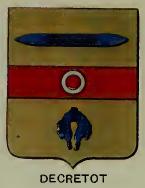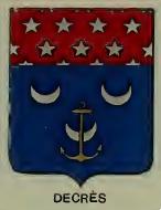 DECOUZ DECOURS Pierre DECOURS, colonel du 21e de ligne, baron de l'Empire par lettres patentes du 27 novembre 1808. Règlement d'armoiries : Informations plus précises sur http://chan.archivesnationales.culture.gouv.fr/ DECRÈS Denis DECRÈS (1761-????), vice-amiral, grand officier de l'Empire, chef de la 10e cohorte de la légion d'honneur, ministre de la marine et des colonies, comte de l'Empire par lettres patentes du juin 1808. Règlement d'armoiries : D'azur, aux trois croissants d'argent posés deux et un, une ancre d'or avec son anneau, brochant sur le croissant de pointe ; au quartier des comtes-ministres brochant sur le tout. Livrées : bleu, blanc et jaune. ![]() Duc de l'Empire par lettres patentes du 28 avril 1813. Règlement d'armoiries : D'azur, à trois croissants, deux et un, d'argent, chargé d'une ancre bouclée,d'or, posée en pal, et brochant sur le croissant de la pointe ; le tout surmonté du chef des ducs de l'Empire. Livrées : les couleurs de l'écu. Informations plus précises sur http://chan.archivesnationales.culture.gouv.fr/ BB/29/974 page 144. Titre de comte accordé à Denys Decrès. Bayonne (24 juin 1808). BB/29/1035 pages 61-62. Titre de duc de Crès accordé à Denis de Crès, à la suite du décret du 13 avril 1813 . Erfurt (28 avril 1813). BB/29/1061 page 5. M. le comte Decrès. BB/29/1060 page 42. M. le duc de Crès, ministre de la marine. DECREST DE SAINT-GERMAIN Antoine-Louis DECREST DE SAINT-GERMAIN (1768-????), général de brigade, baron de l'Empire par lettres patentes du 15 janvier 1809. Règlement d'armoiries : D'or, à la fasce échiquetée de sable et d'azur, accompagnée en pointe de trois grues de sable tenant chacune de la dextre leur vigilance d'argent et soutenues d'une terrasse de sinople ; au quartier des barons militaires. Livrées : les couleurs de l'écu, le verd en bordure seulement. Informations plus précises sur http://chan.archivesnationales.culture.gouv.fr/ BB/29/966 page 298. Titre de baron, accordé par décret du 19 mars 1808 , à Antoine, Louis Decrest de Saint Germain. Valladolid (15 janvier 1809). BB/29/1063 page 110. M. le baron Decrest de Saint-Germain. DECRÉTOT Jean-Baptiste DECRÉTOT (1743-????), administrateur de la caisse d'amortissement, chevalier de l'Empire par lettres patentes du 18 juin 1809. Règlement d'armoiries : D'or, à la fasce de gueules du tiers de l'écu au signe des chevaliers, accompagné en chef d'une navette de sable et en pointe d'une toison d'azur. Livrées : les couleurs de l'écu. Informations plus précises sur http://chan.archivesnationales.culture.gouv.fr/ BB/29/970 page 448. Titre de chevalier, accordé à Jean, Baptiste Décretot, à la suite du décret du 14 brumaire an XIII le nommant membre de la Légion d'honneur. Schoenbrunn (18 juin 1809). BB/29/1072 page 143. M. le chevalier Decretot. DEDELAY D'AGIER Claude-Pierre DEDELAY D'AGIER (1750-????), sénateur, comte de l'Empire par lettres patentes du 15 juin 1808. Règlement d'armoiries : D'azur, au lion rampant d'or, entre deux pals de même brochant sur l'extrémité des pattes et de la queue du lion ; au quartier des comtes-sénateurs brochant sur le pal à dextre. Livrées : bleu, jaune et blanc. Informations plus précises sur http://chan.archivesnationales.culture.gouv.fr/ BB/29/974 page 135. Titre de comte accordé à Claude, Pierre Dédelay d'Agier. Bayonne (15 juin 1808). BB/29/1061 page 60. M. le comte Dedelay d'Agier. DEDEM DEDOUAL Otto-Antoine DEDOUAL (1770-????), chef de bataillon au 28e léger, chevalier de l'Empire par lettres patentes du 3 février 1813. Règlement d'armoiries : Tiercé en fasce : au premier, de gueules soutenu d'azur, le gueules à la demi figure vêtue d'un costume suisse, tenant de la sénestre une hallebarde, adextrée d'un coq et sénestrée d'une étoile, le tout d'or ; au deuxième, d'argent ondé ; au troisième, de gueules au signe des chevaliers légionnaires. Livrées : les couleurs de l'écu. Informations plus précises sur http://chan.archivesnationales.culture.gouv.fr/ BB/29/972 page 476. Titre de chevalier accordé à Otto, Antoine Dedoual, à la suite du décret du 18 septembre 1811 le nommant officier de la Légion d'honneur. Paris (3 janvier 1813). BB/29/1075 page 217. M. Dedoual, chef de bataillon au 28e d'infanterie de ligne. DEFAYSSE DEFERMON Jacques DEFERMON (1752-????), conseiller d'Etat à vie, président de la section des finances, ministre d'Etat, comte de l'Empire par lettres patentes du mai 1808. Règlement d'armoiries : D'argent, moucheté d'hermines au sauvageon de sable à deux griffes, la moitié senextre à feuilles et pommes d'argent, la moitié dextre à feuilles et pommes d'or ; au franc-quartier de comte-ministre. Livrées : or, bleu et sable. Informations plus précises sur http://chan.archivesnationales.culture.gouv.fr/ BB/29/974 page 103. Titre de comte accordé à Jacques Defermon. Bayonne (mai 1808). BB/29/1060 page 102. M. le comte de Fermon. DEFERMON Jean-François DEFERMON (1762-????), préfet des Hautes-Alpes, membre du collège électoral de la Mayenne, baron de l'Empire par lettres patentes du 14 avril 1810. Règlement d'armoiries : D'hermines, au sauvageon de sable à deux greffes, celle à dextre à feuilles et pommes d'or, celle à sénestre à feuilles et pommes d'argent ; au franc-quartier des barons préfets. Livrées : les couleurs de l'écu. Informations plus précises sur http://chan.archivesnationales.culture.gouv.fr/ BB/29/967 page 147. Titre de baron, accordé par décret du 3 décembre 1809 , à Jean, François Defermon. Compiègne (14 avril 1810). BB/29/1064 page 217. M. le baron Defermon. DEFOURCROY Charles-Louis DEFOURCROY (1770-????), consul à la Corogne, chevalier de l'Empire par lettres patentes du 14 juin 1810. Règlement d'armoiries : D'azur, au chevron d'or, accompagné de trois croissants d'argent ; à la champagne de gueules du tiers de l'écu au signe des chevaliers. Livrées : bleu, jaune, blanc, rouge. Informations plus préci